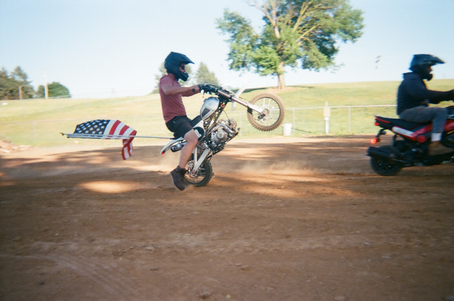 Corey busting a glorious wheelie at the Michaux Dual Sport pitbike races.